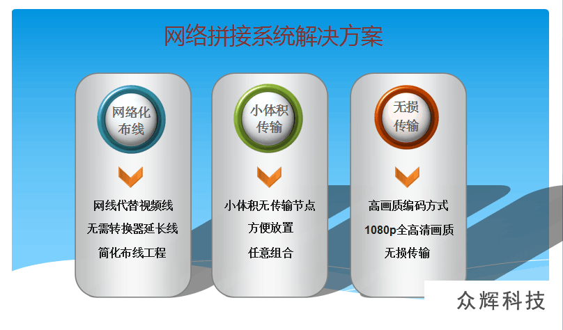 眾輝及時(shí)跟上當(dāng)今快速創(chuàng)新的步伐,進(jìn)行網(wǎng)絡(luò)產(chǎn)品設(shè)計(jì)和開發(fā),把新的產(chǎn)品、新的技術(shù)應(yīng)用到安防監(jiān)控、視頻會(huì)議系統(tǒng)中,利用現(xiàn)有網(wǎng)絡(luò),成熟的網(wǎng)絡(luò)技術(shù)和拼接技術(shù),實(shí)現(xiàn)網(wǎng)絡(luò)拼接,這是對(duì)傳統(tǒng)的顛覆,拼接的一次革命。